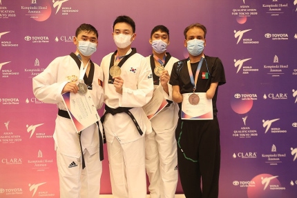 (서울=연합뉴스) 주정훈(서울시장애인태권도협회)이 23일(현지시간) 요르단 암만에서 열린 2020 도쿄 패럴림픽 아시아 선발전 남자 75㎏급(K44)에서 1위에 올라 우리나라 태권도 선수로는 처음으로 패럴림픽 무대에 서게 됐다. 사진은 도쿄 패럴림픽 아시아 선발전에서 금메달을 딴 주정훈(왼쪽 두번째). 2021.5.24